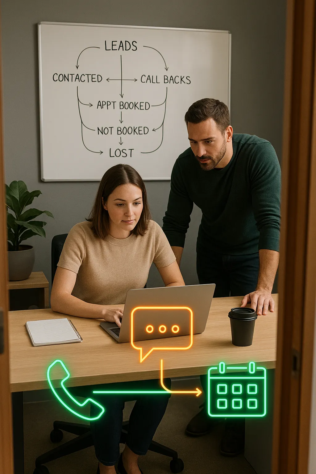 You’ll see the whole pipeline in one place: how many leads came in, how many were contacted, how many booked, and how many showed. If a step is weak, we fix the system instead of blaming another “bad batch of leads.”